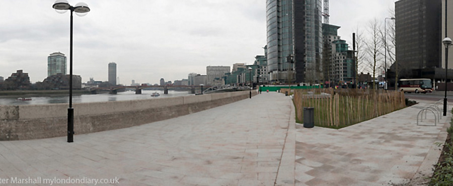 Upriver from the river wall roughly where the pictures above were taken