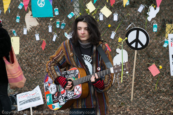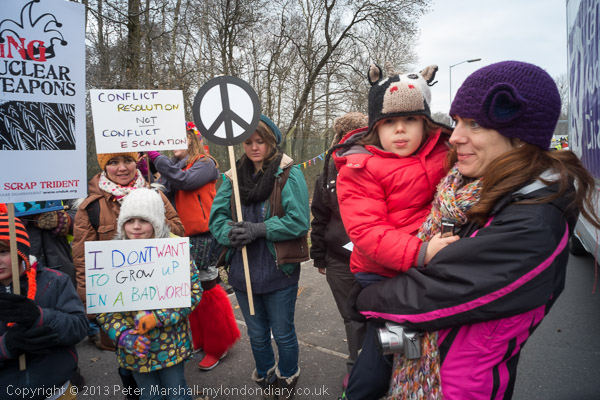 Singing the anti-nuclear song 'One nuclear bomb can ruin your whole day'. A poster asks How Many Schools and Hospitals will be sold to replace Trident