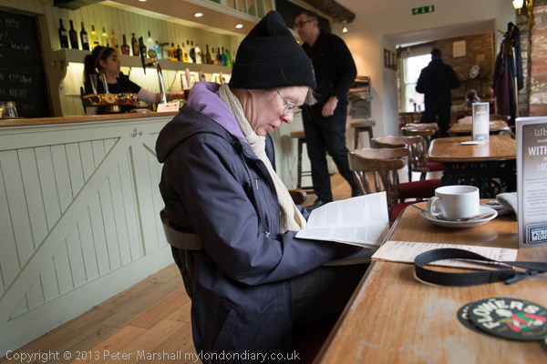 Linda drinking coffee in the White Hart, Ashton Keynes