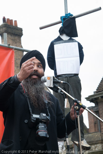 Five men with Sikh flags at the back of the stage, and to their right a hanging figure