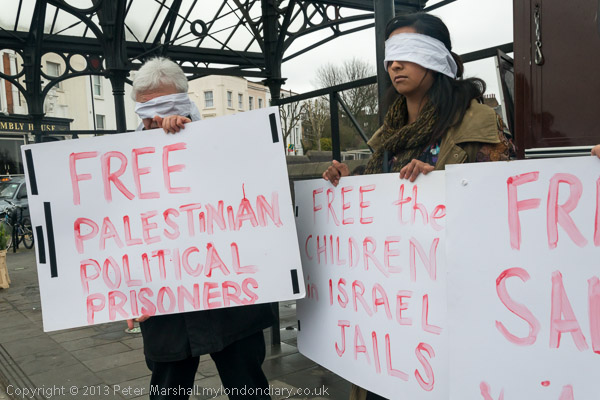 Human rights protesters from Camden with blindfolds and placards calling for the release of Palestinian