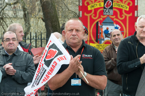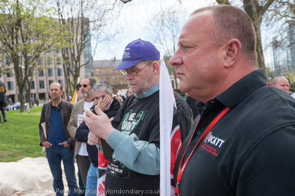 ![]() Les McCluskey, General Secretary of Unite, was the first speaker ![]() ![]() ![]() ![]() Les McCluskey speaking under the statue of the worker on Tower Hill ![]() ![]() A Hazards magazine shirt - 'We didn't vote to die at work' ![]() Margaret Sharkey of the London Hazards Centre speaking |