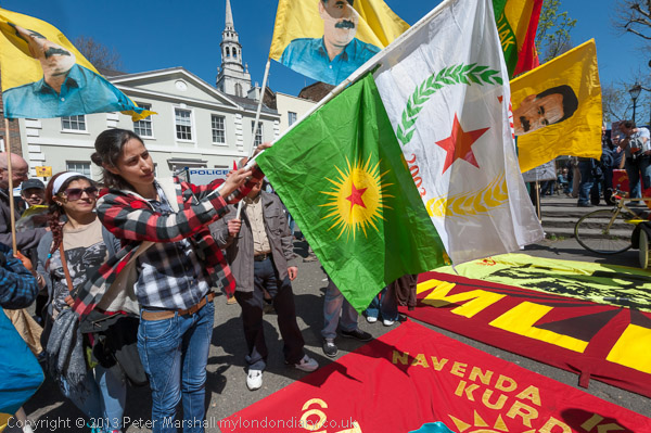 Kurdish Workers party (PKK), Syrian Kurdish Democratic Union Party (PYD) flags and Abdullah Ocalan flags