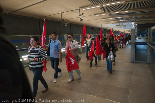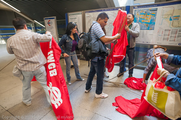 At Canary Wharf station they get the IWGB flags ready for the protest
