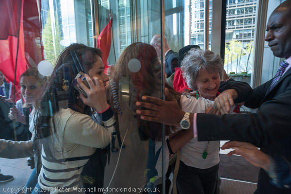Protesters are brieged by Alberto Durango at Canada Water