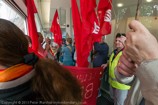 ![]() Shortly some of the protesters go into the lobby of the Capgemini building ![]() ![]() and protest there for a minute or two ![]() ![]() ![]() before walking out back to the pavement ![]() ![]() where the noise continues |