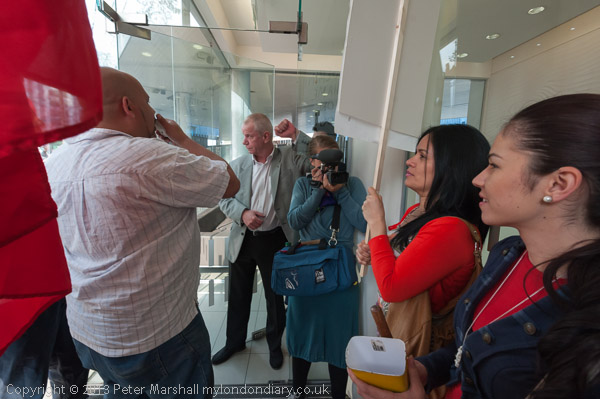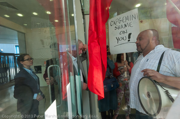 ![]() Alberto points to the Capgemini building ![]() 'Capgemini Shame on You!' and 'Stop Racism at Capgemini' placards ![]() The cleaners try to go inside again ![]() but are stopped by a man standing in the doorway - they don't try to push past ![]() but keep up their protest in the entranceway ![]() ![]() ![]() ![]() ![]() Capgemini have rather dirty windows but I took a picture through them of Alberto Durango facing the people at the door |