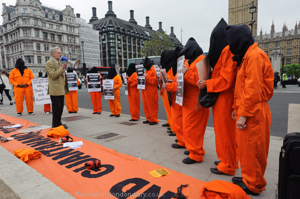 Jeremy Corbyn MP speaking to protesters in their orange jump-suits and black hoods in front of Parliament