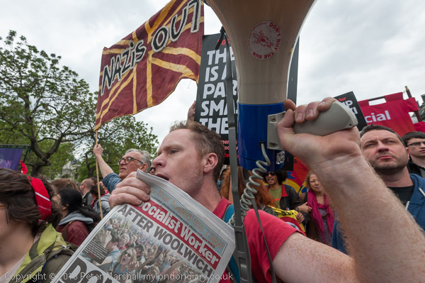 An anti-fascist with the Socialist Worker and a megaphone