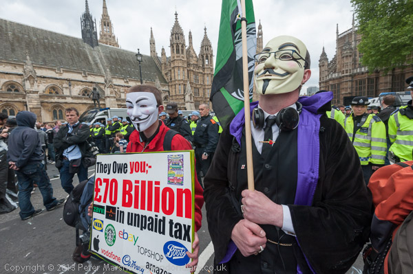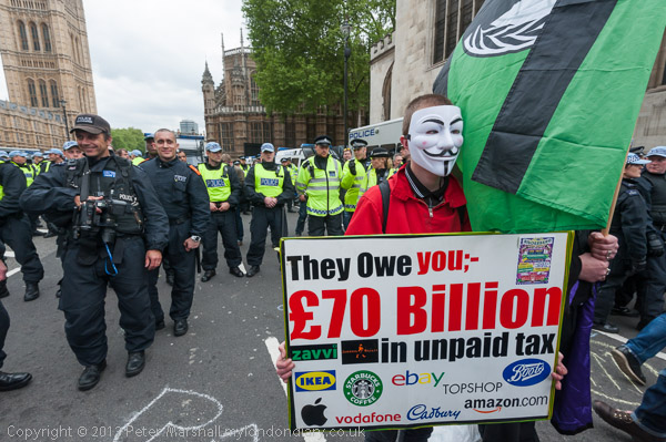 'Anonymous' protester with a placard about unpaid tax by corporations in front of police photographer and police