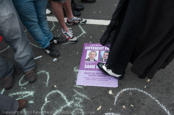 A protester shows contempt by stamping on the poster showing Breivik and Griffin