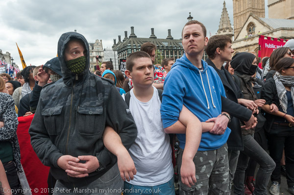 Protesters link arms to make it hard for police snatch squads to grab individuals