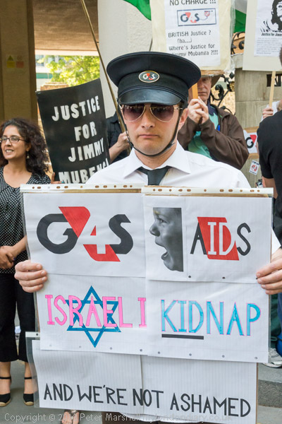 'G4S aids Israeli Kidnap - and we're not ashamed' - a man in a peaked cap with a G4S badge