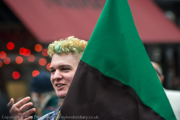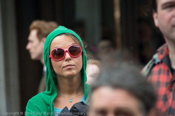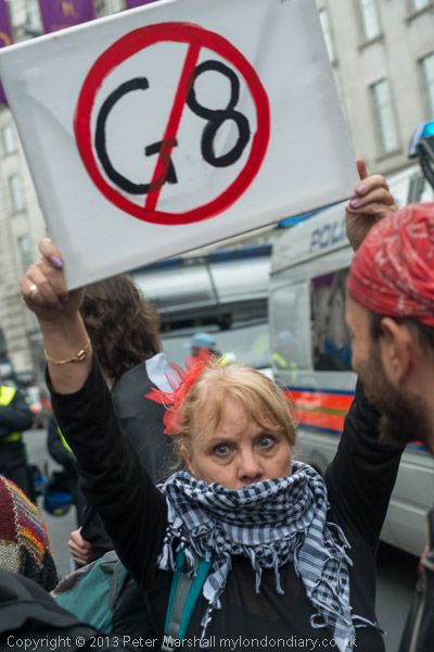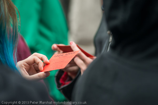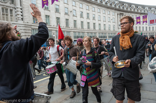 A police officer comes to tell the protesters they need a licence to play music on the street in Westminster