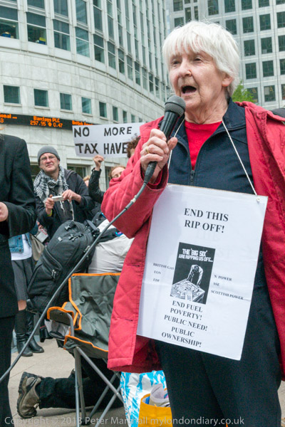 Behind the speaker talking about 'No Dash for Gas' the display of exchange rates and stock prices