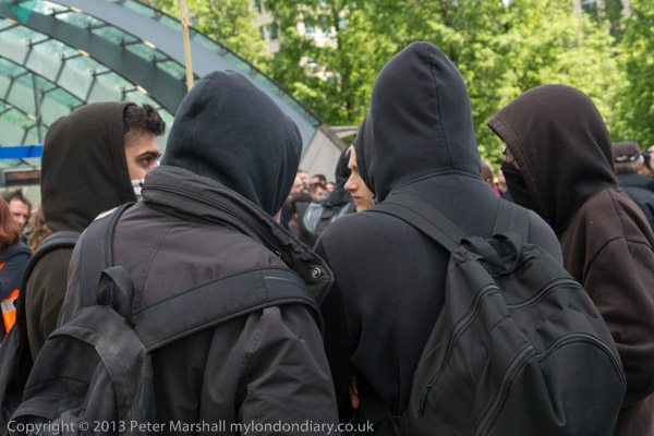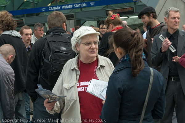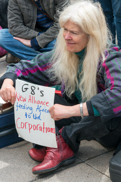 'G8's New Alliance feeding Africa to the Corporations' and the corporate US flag in front of Canary Wharf