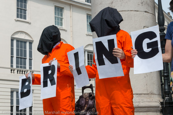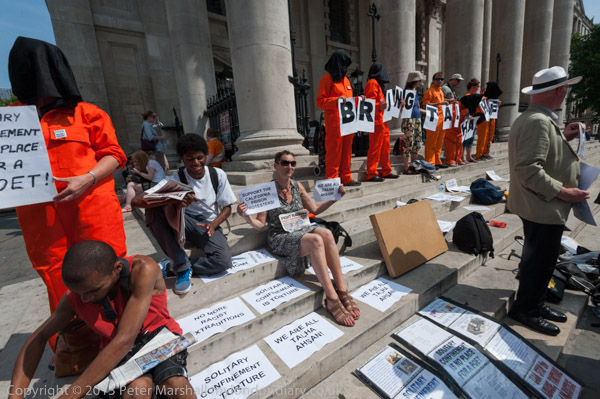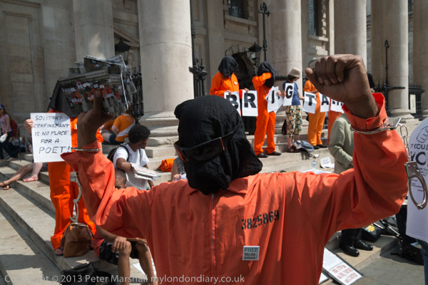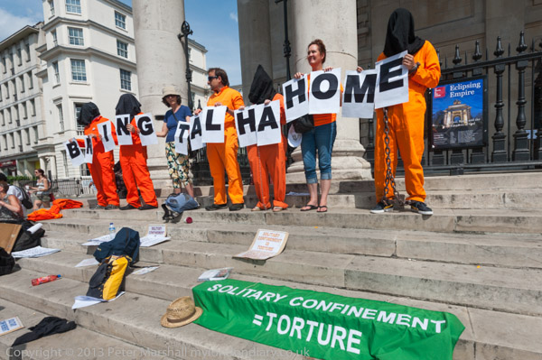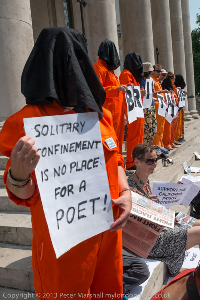 'Solitary Confinement = Torture' reads a banner on the steps below those holding the message