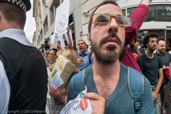 ![]() Police moved the protesters back to allow people to walk past on the pavement ![]() ![]() ![]() ![]() and the protesters kept up a noisy protest ![]() ![]() ![]() ![]() |