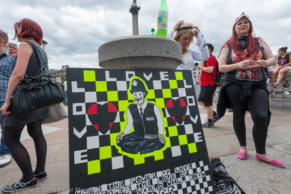 The celebration of Al Quds day on the last Friday of Ramadan was introduced by Ayatollah Khomeini in Iran in 1979 and its observance has spread, mainly in Arab and Muslim countries. The march has in some years been opposed by various Zionist and Iranian freedom, communist and royalist movements as well as fringe UK right wing groups including the EDL and March for England and others. This year the start of the march was watched by one dancing eccentric and two young men who have previously been seen at ultra-right events, but there was no protest.