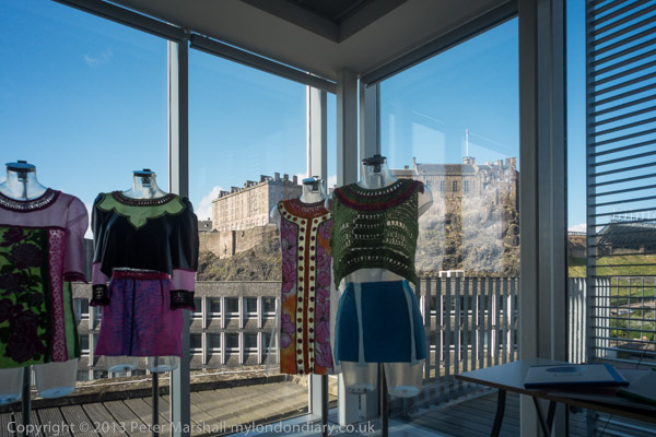 We started the day with an early performance of a play about a male clergyman and a female quantum physicist, time travel and religion, which was very clever, quite funny but too early in the morning for me. Then I went off to do a little work - see the separate post about the UAF protest against the SDL marching in Edinburgh. Afterwards we went back through the High St to go to the postgrad show at the College of Art. The fine art photography seemed rather disappointing, with only one student whose work I found of much interest, and the one exception was someone who had obviously been a succesful photographer before joining the course. But there was some interesting work in other areas, notably product design, and some interesting views of the castle and across the city from the fifth floor of the newer building.