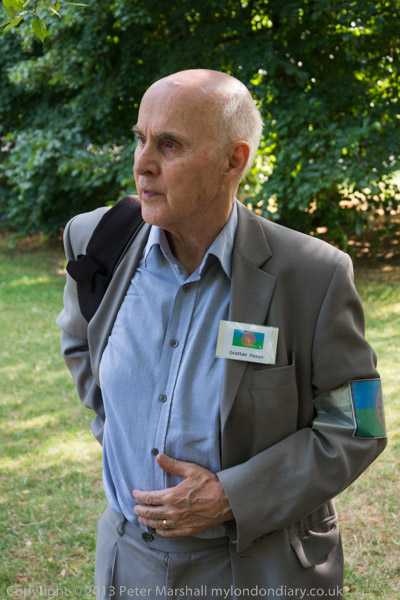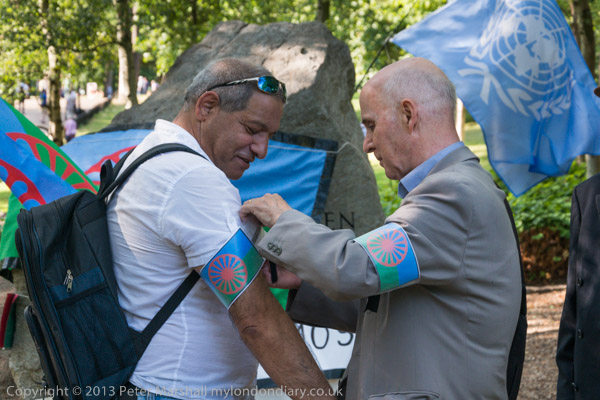 Grattan Puxon puts a Romam flag armband on one of the others taking part