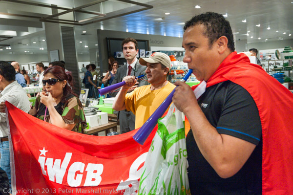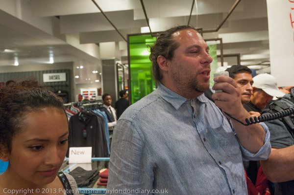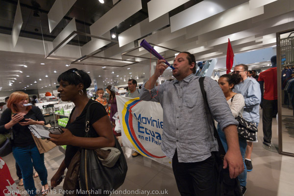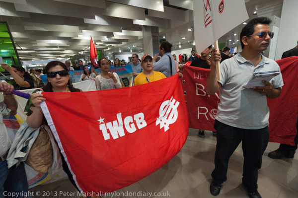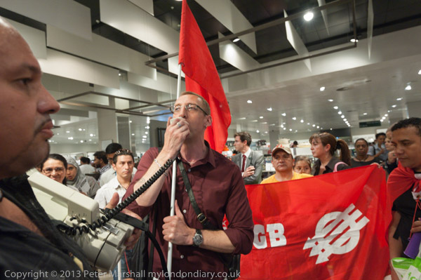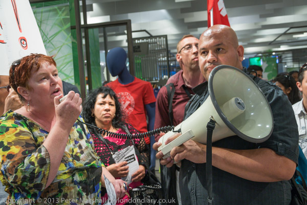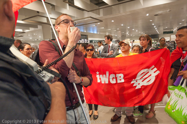 Alberto Durango of the IWGB speaks in the entrance to John Lewis - telling them "we''ll be back' until cleaners get justice