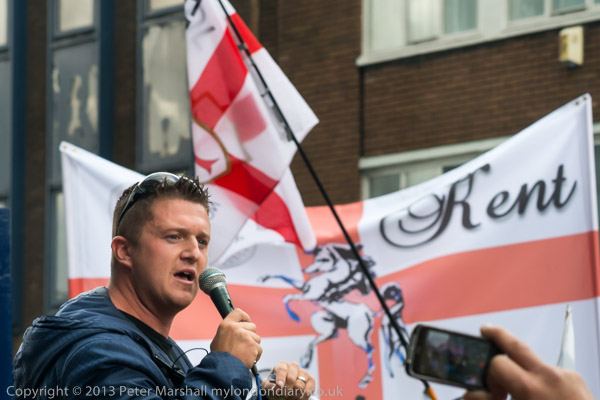 A woman with the EDL Newcastle Division flag watches Tommy speaking