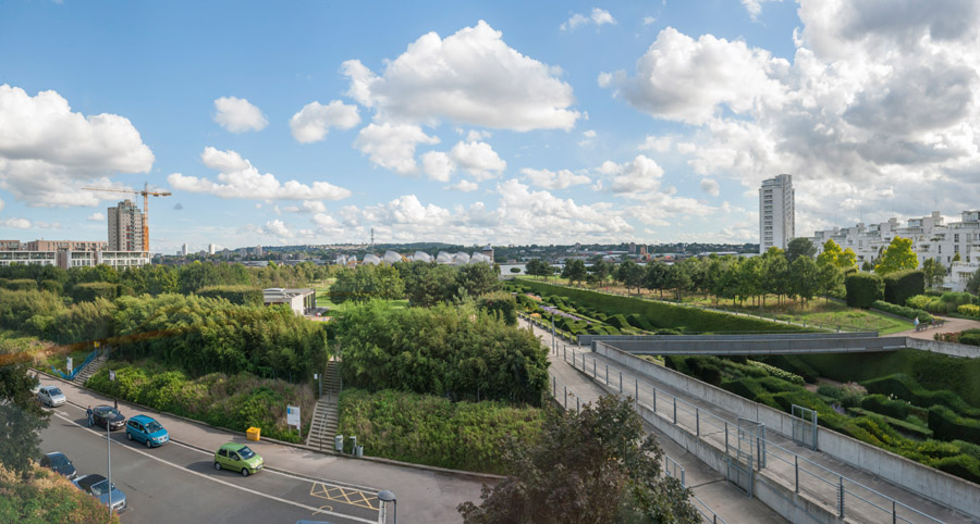 Panoramas from Pontoon Dock DLR with Thames Barrier, Thames Barrier Park and Barrier Point.      Above 90 degree horizontal view, below 109 degrees.