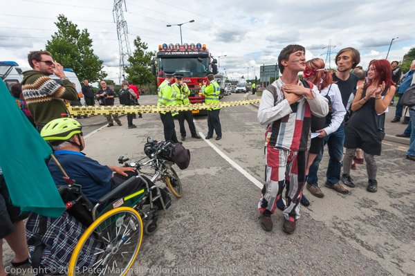 The dancers dance in front to the lorries that can't get in