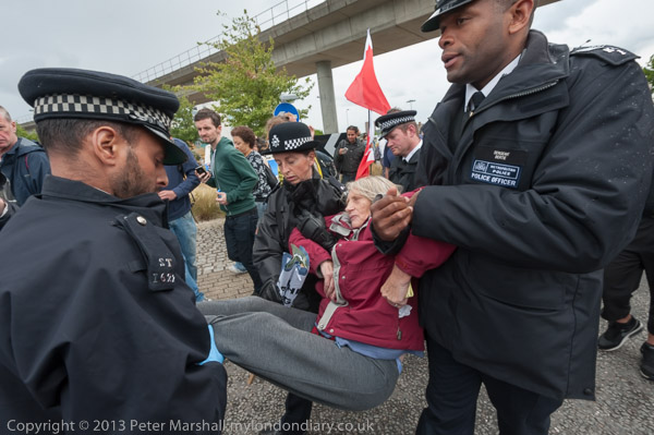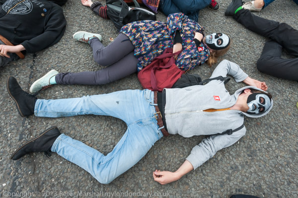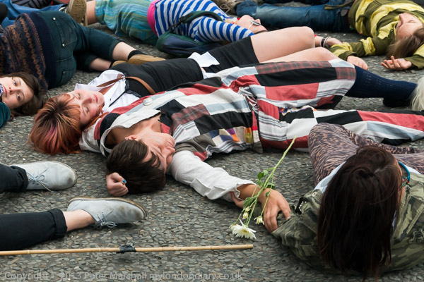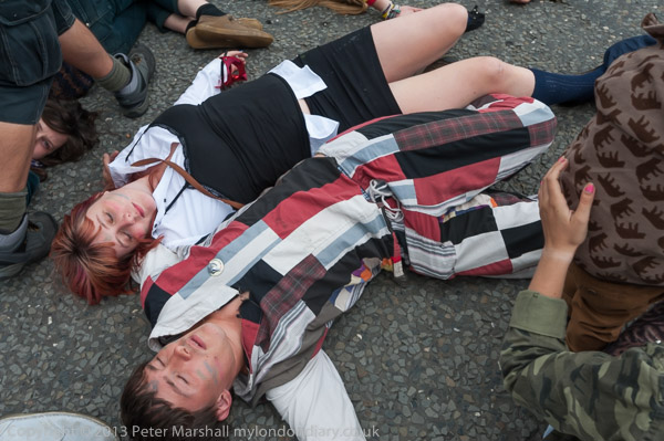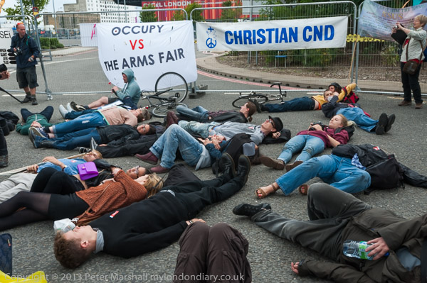 Soon there are quite a few people feigning dead on the road outside the gate to the ExCel centre