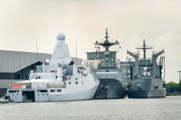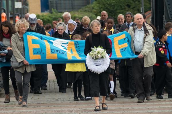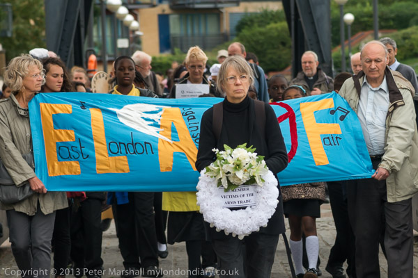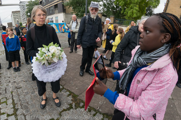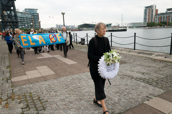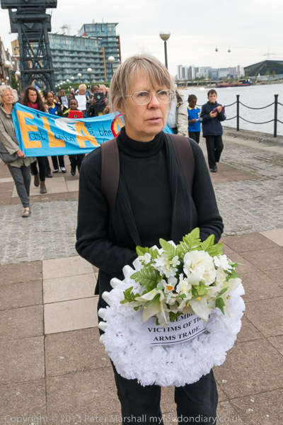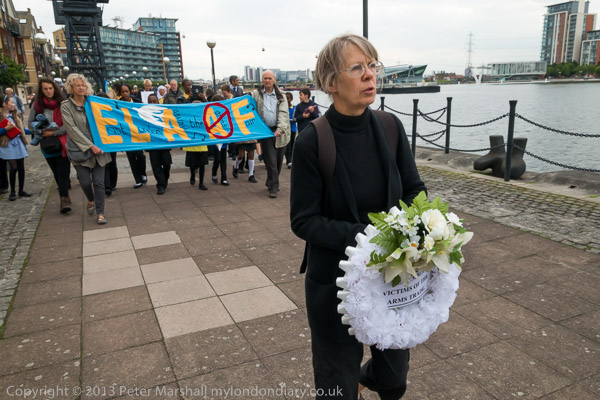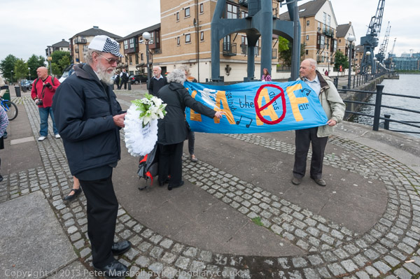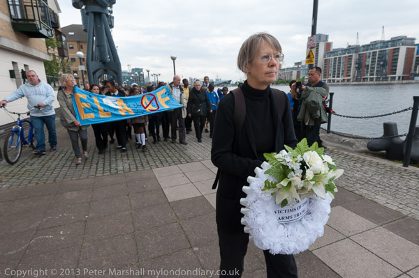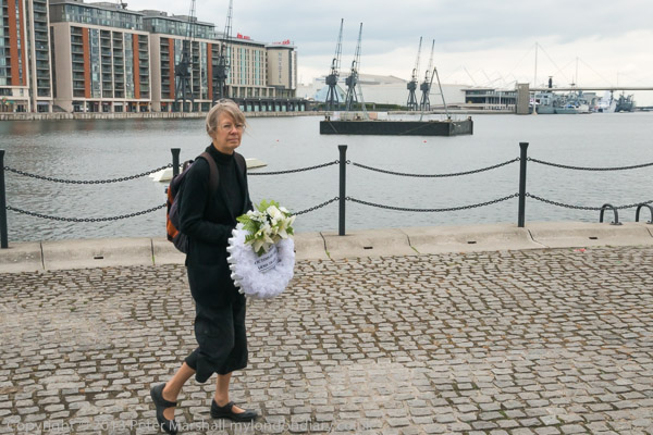 Linda with the wreath, and behind her at the right, the ExCel centre and several warships moored for the arms fair