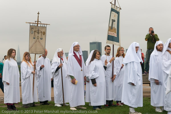 The skyline of London behind the process with Ceridwen, the two banners and the Chief Druid