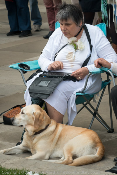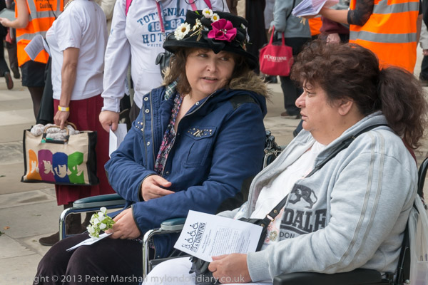 A woman in white with white lilies and a poster 'Atos Kills! Enough is Enough'