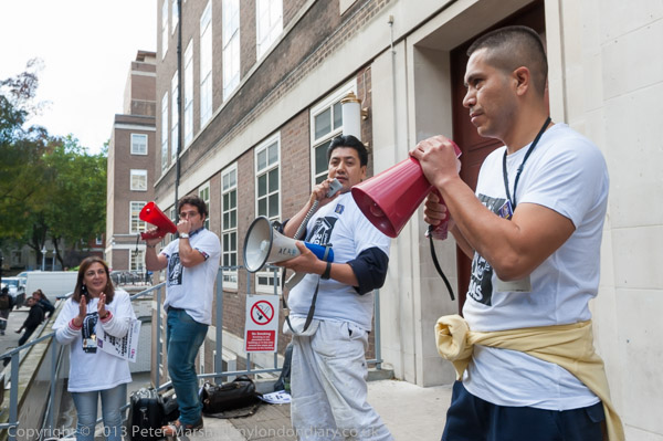 Supporters of the '3 Cosas' campaign for sickpay, holidays and pensions for all workers at the University of London today defied University management ban of protests by holding a noisy protest in and around Senate House.