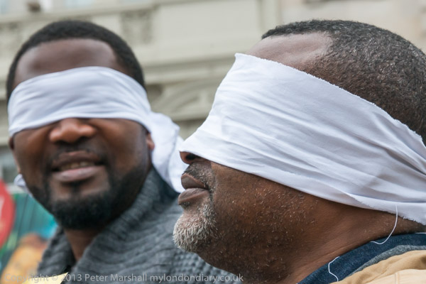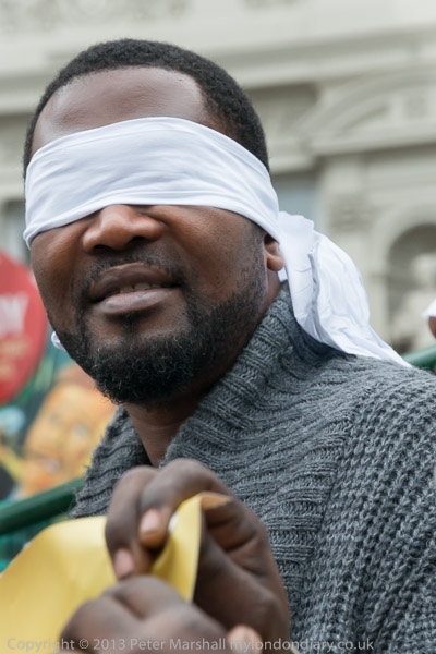The banner give the figures - 8m murdered, 500,000 rape victims....