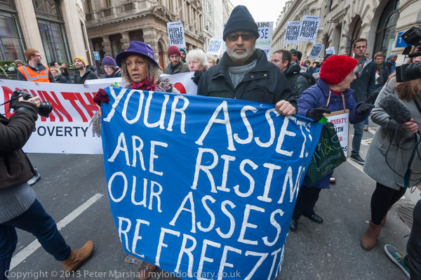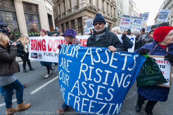 Pensioners with a banner 'Your Assets are rising Our Asses are Freezing'
