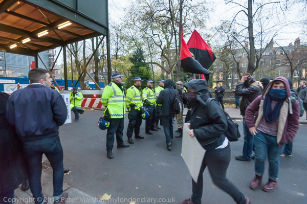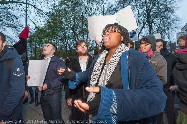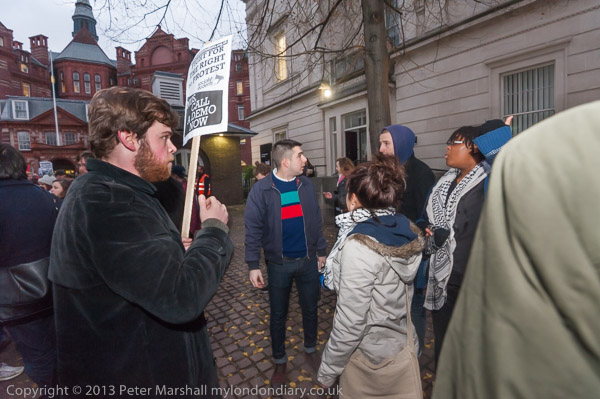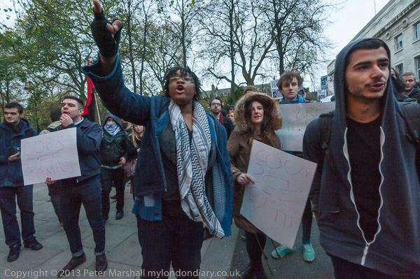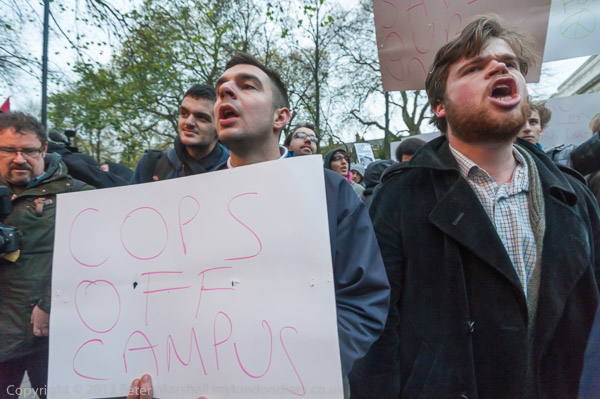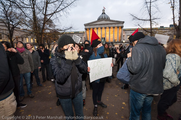 Students stop and shout for a few minutes outside the Malet St gates of Senate House