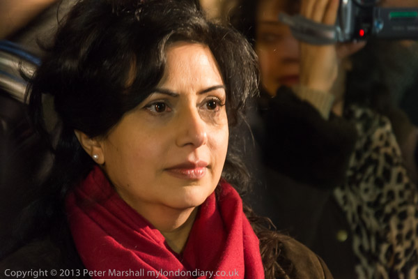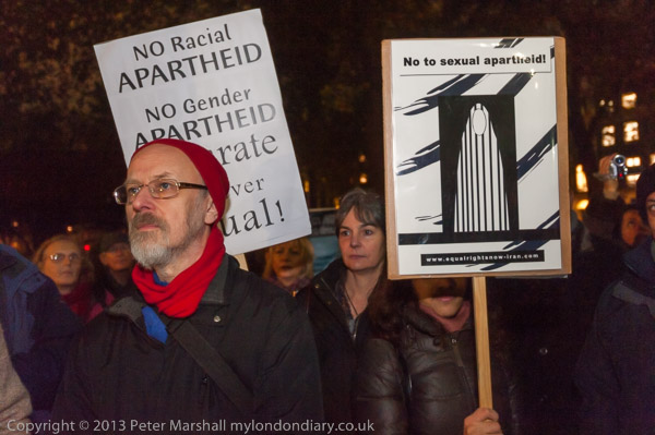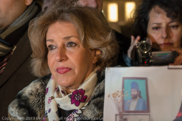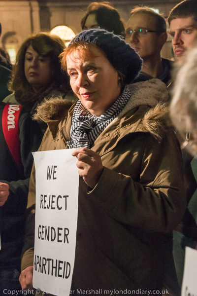 Maryam Namaze carries a poster for Fitnah - Movement for Women’s Liberation, "a protest movement demanding freedom, equality, and secularism and calling for an end to misogynist cultural, religious and moral laws and customs, compulsory veiling, sex apartheid, sex trafficking, and violence against women" which was one of the organisers of the protest