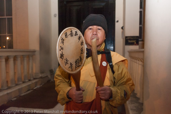 A Buddhist monk stands in front of the door to the Syrian embassy