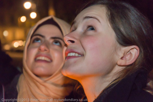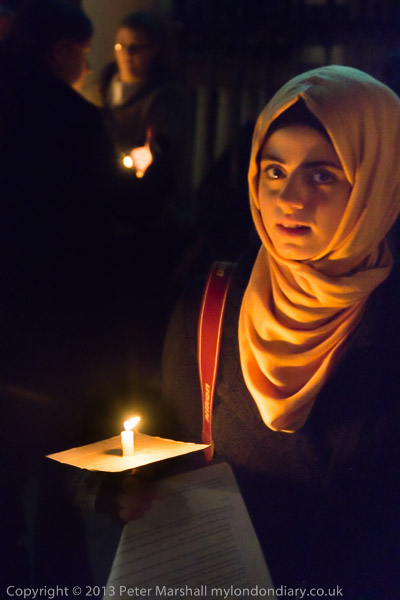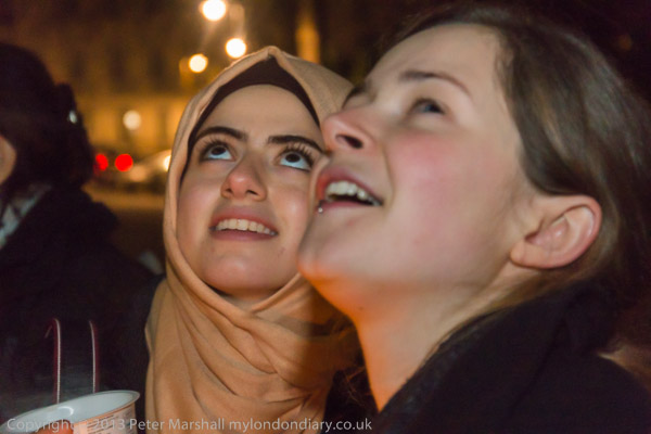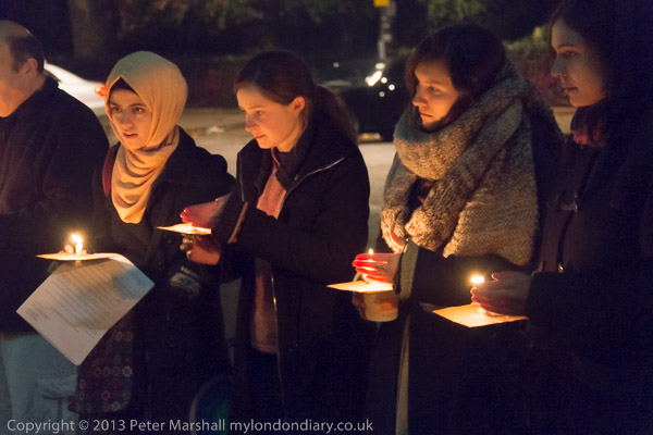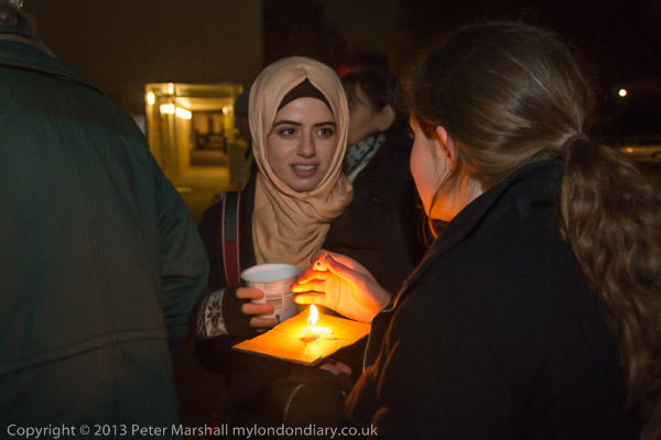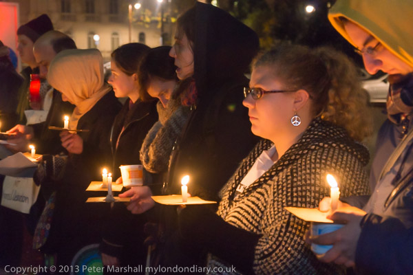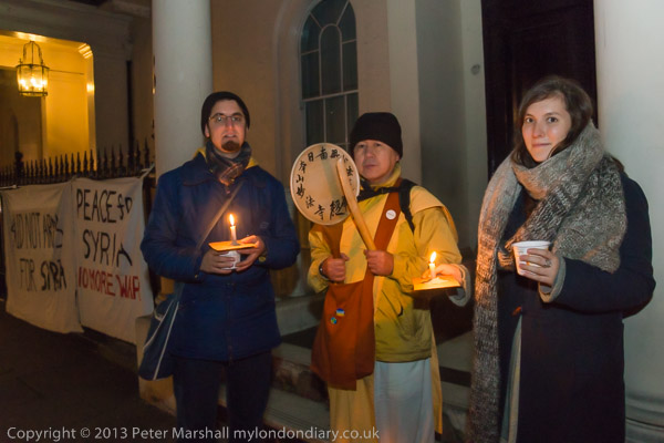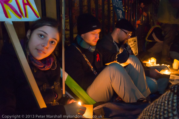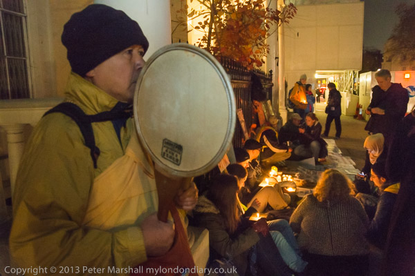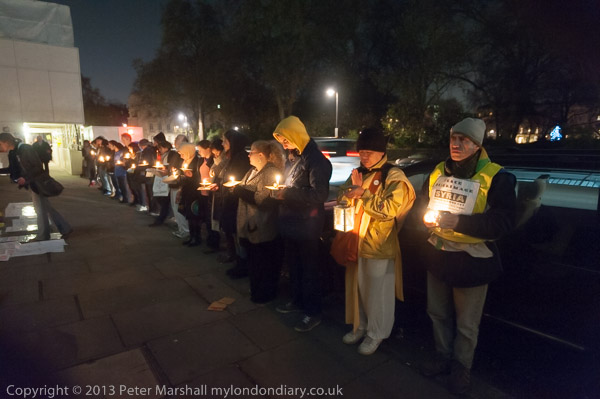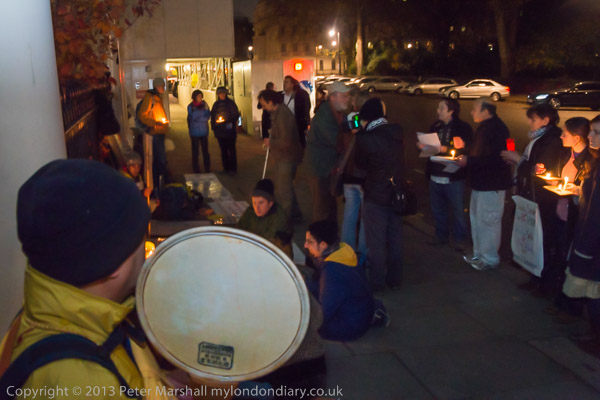People in the vigil look up towards the embassy, but there was no sign that those inside had noticed the vigil