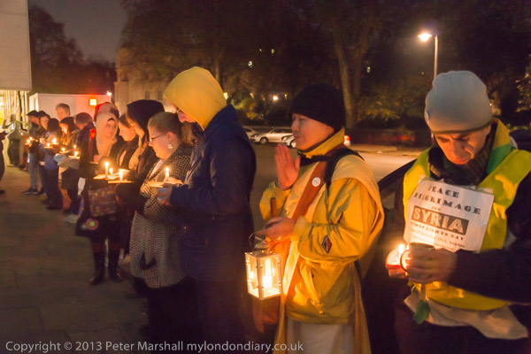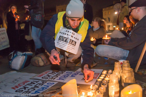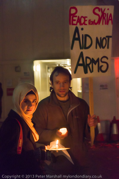 Banners were tied to the railings, including 'Peace for Syria - No More War'