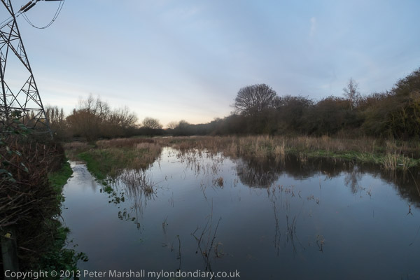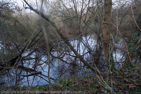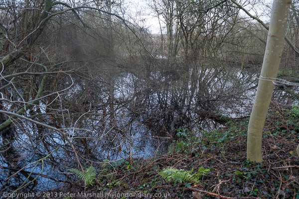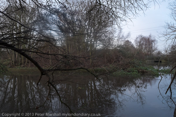The Wyradisbury, a branch of the Colne is glimpsed in the background behind the ponds