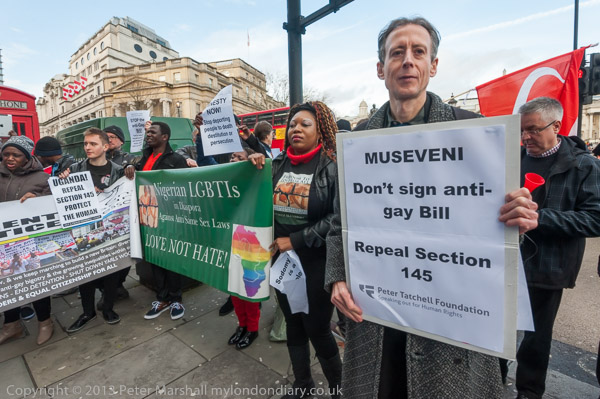 Peter Tatchell with the message of the protest to Museveni - Don't sign anti-gay Bill - Repeal Section 145'