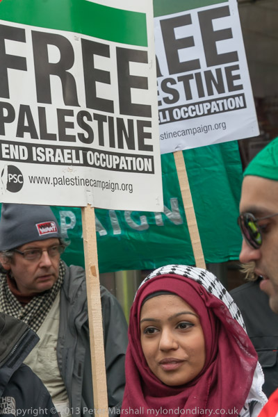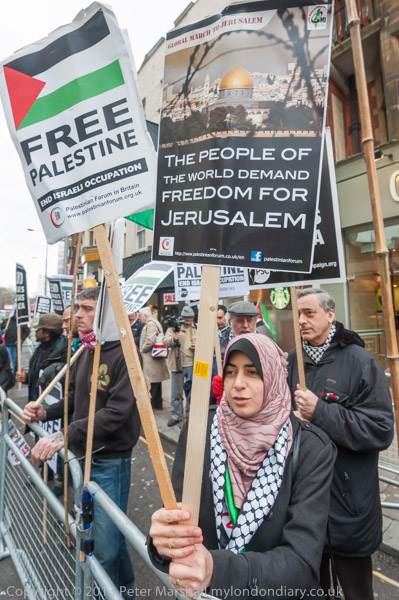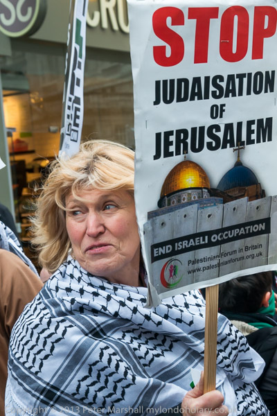 The Palestinian Forum in Britain placards called for an end to Israeli occupation and demanded a free Jerusalem and an end to Judaisation of the city