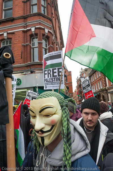 A few protested in Anonymous masks. Many wore Palestinian scarves, and there were many women in Muslim headscarves