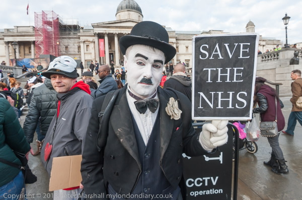 'Save the NHS' placard held up by a mime dressed as Charlie Chaplain's downtrodden little man in baggy pants and bowler hat