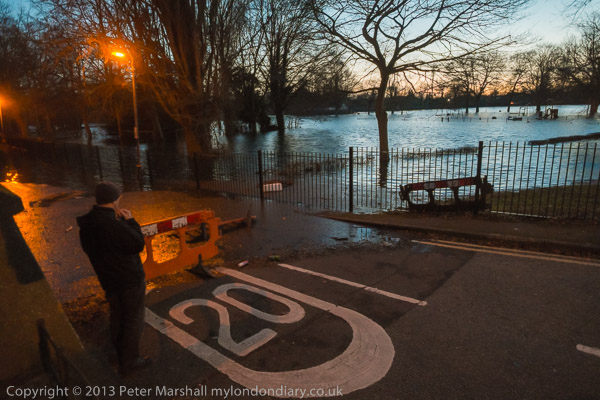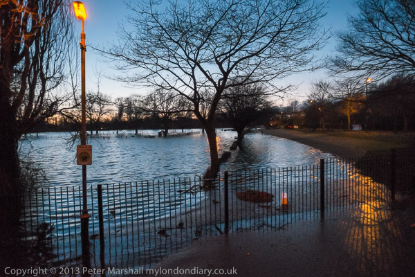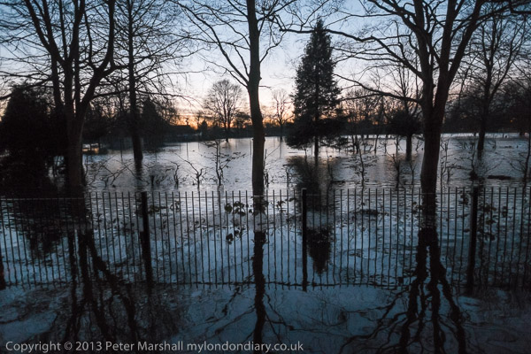 It was well after sunset before I could go out again. The Jubilee Gardens were almost completely flooded
