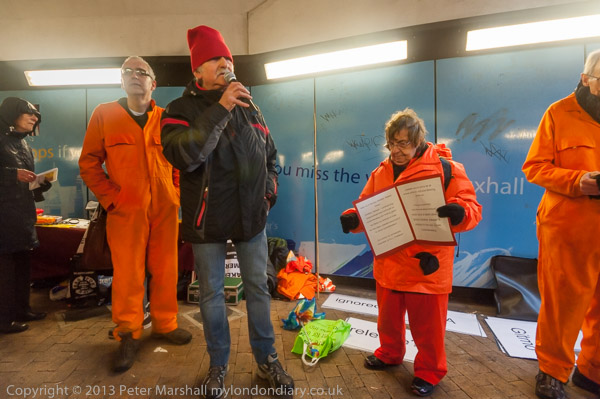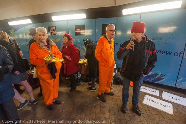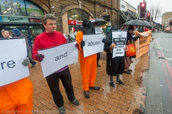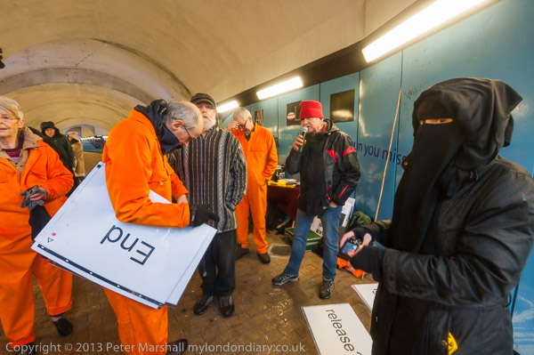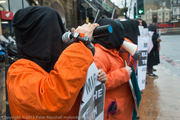 'Save Shaker Aamer' banner and protester in orange jumpsuit, black hood and chains