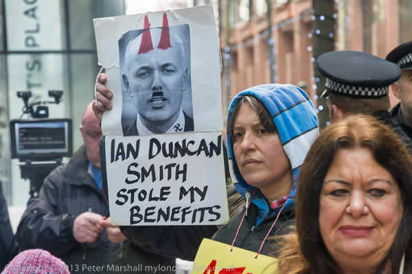 The poster 'Ian Duncan Smith Stole My Beneftis' reflects these corrupt practices, showing him as as devil & as Hitler