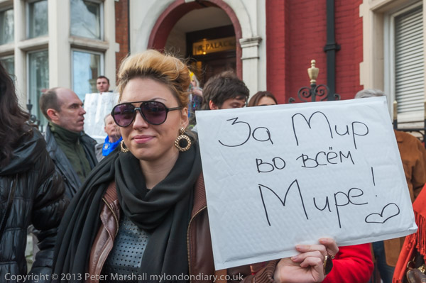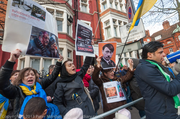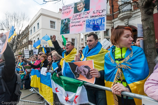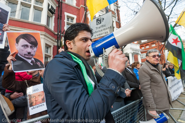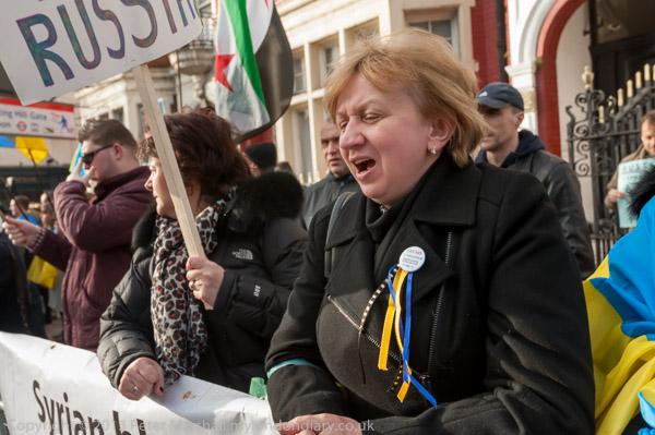 The Ukrainians protested with a Syrian flag next to the Ukrainian - both countries have suffered because of Putin's interference